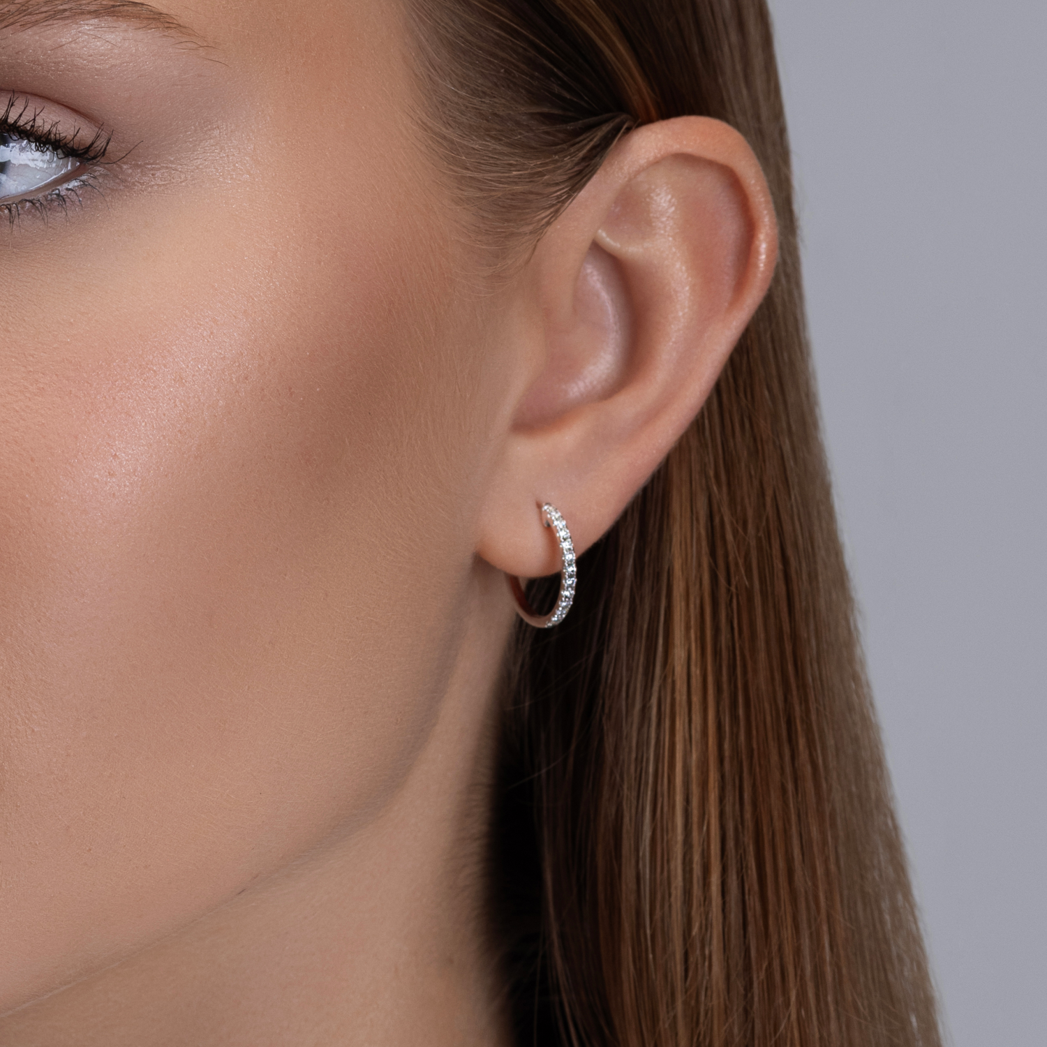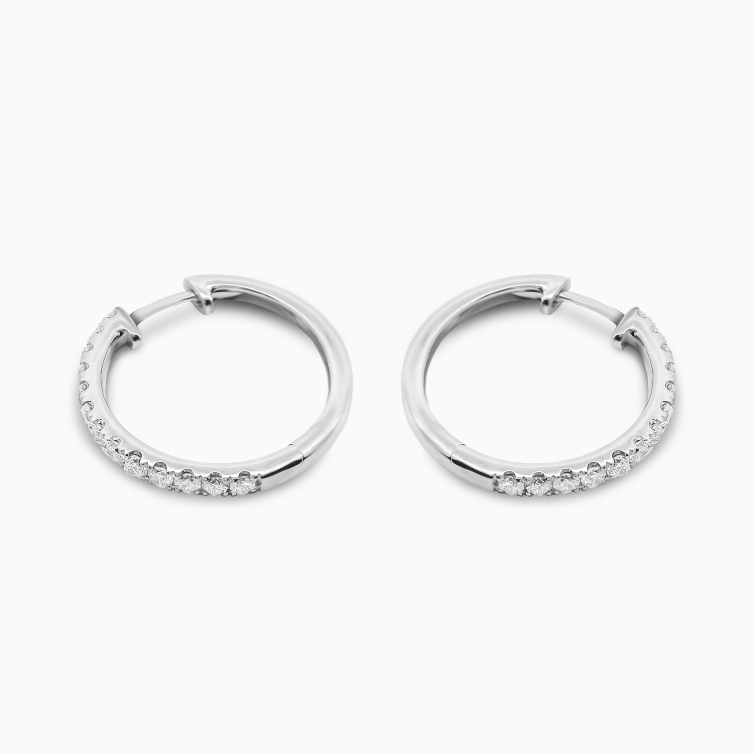 A timeless icon reimagined, these 18k white gold diamond hoop earrings embody refined sophistication. Each earring is adorned with a 0.38 ct round cut diamond of F color and VS clarity, radiating captivating brilliance that enhances the sleek hoop silhouette. Expertly crafted for both comfort and style, these diamond hoops strike the perfect balance between modern elegance and classic luxury. Their versatile design makes them ideal for elevating everyday outfits or adding a polished finish to evening looks. A must have piece for the contemporary jewelry collection, they exude understated glamour with lasting appeal.