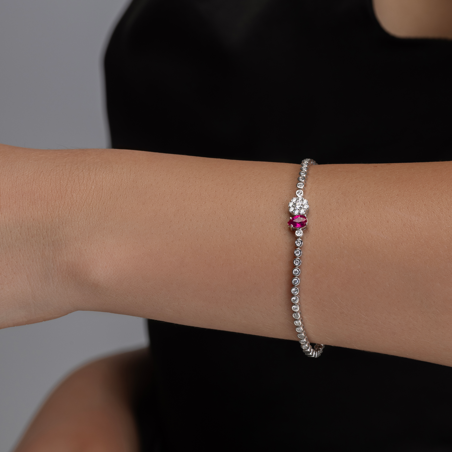 Crafted in 18k white gold, this exquisite bracelet is the embodiment of timeless elegance and refined luxury. At its heart lies a captivating 0.48 carat pear cut ruby, radiating with a deep, velvety blue hue that symbolizes wisdom, nobility, and everlasting beauty. The sapphire is gracefully complemented by a dazzling cluster of 0.80 carat round cut diamonds, meticulously set to enhance brilliance and light. Each diamond reflects pure sophistication, creating an extraordinary harmony with the sapphire’s rich color. Designed with impeccable craftsmanship, the bracelet’s delicate yet striking form makes it a perfect statement of modern luxury. Whether worn as a symbol of love or as a distinguished addition to your jewelry collection, this masterpiece effortlessly combines prestige, elegance, and timeless charm.