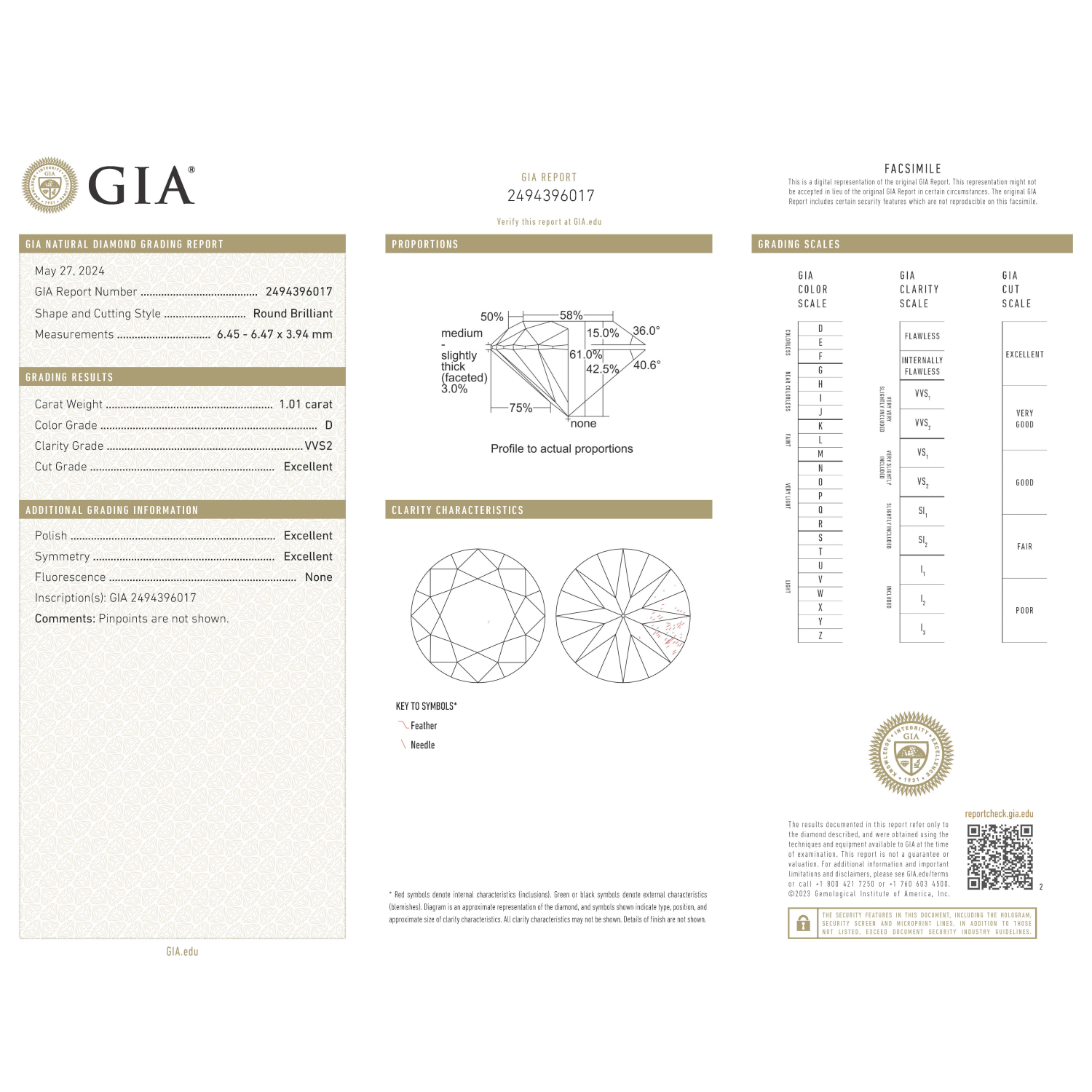 This exquisite solitaire ring is crowned with a stunning 1.01 carat round cut diamond, featuring the rare D color and exceptional VVS2 clarity. Certified by GIA under number 2494396017, this diamond offers extraordinary brilliance through its flawless cut and unparalleled clarity. Its elegant and minimalist design adds a sophisticated touch of timeless elegance to every moment. With its impeccable quality and unique sparkle, it is the perfect choice to immortalize the most special moments of your life. Each Vals jewelry piece is brought to life with its own unique elegance and craftsmanship. Due to this distinctive design process, dimensions, carat weight, and gemstone characteristics may subtly vary from piece to piece.