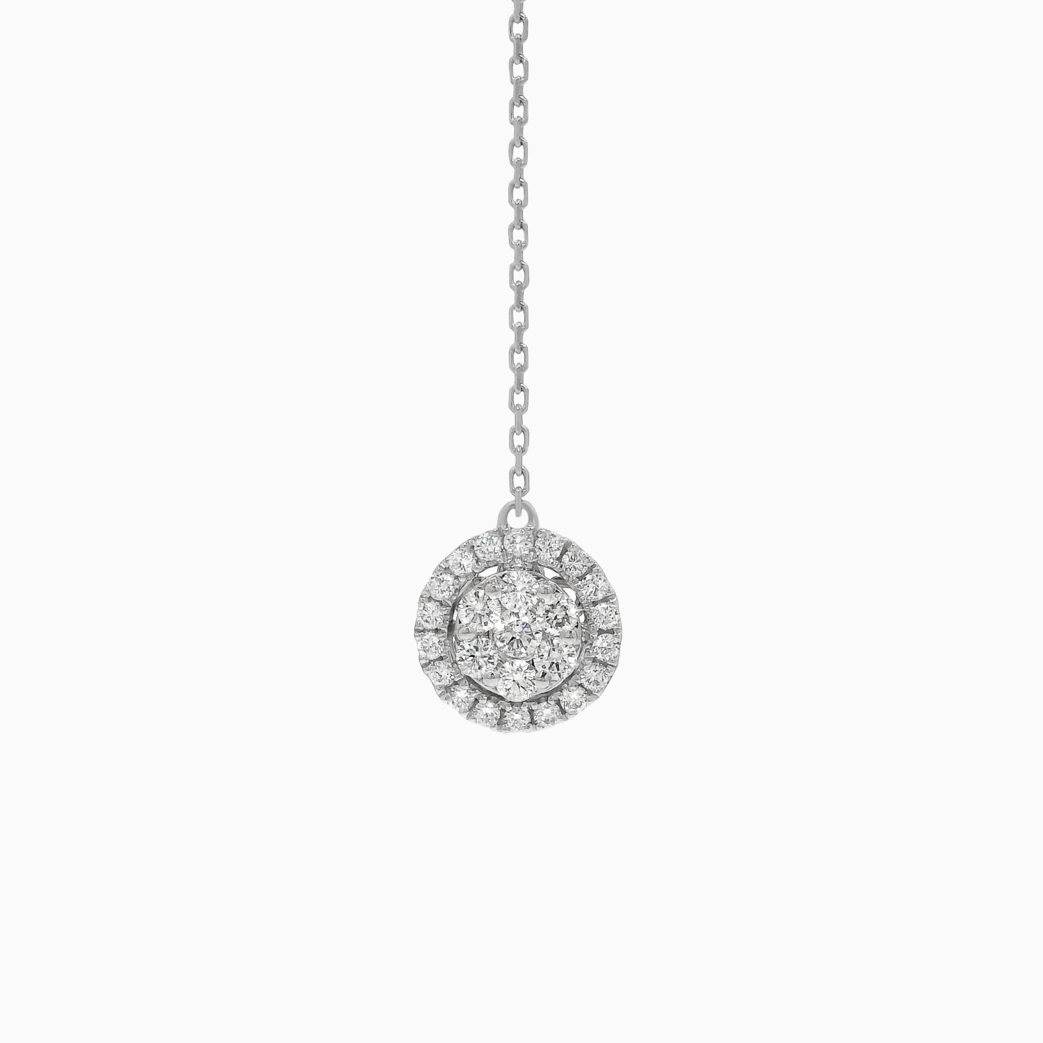 Exquisitely crafted in 18k white gold, this luxurious necklace features a striking baguette cut diamond at its center, gracefully framed by a halo of sparkling round cut diamonds. The design elegantly extends along the chain, adorned with additional round cut diamonds that create a continuous flow of brilliance, enhancing the necklace’s layered sophistication and modern glamour. Perfectly balancing contemporary design with timeless elegance, this necklace makes a statement for special occasions, evening events, or as a refined accent to elevate everyday style. The interplay of the central baguette diamond with the surrounding round diamonds creates a dazzling visual effect that captures light beautifully from every angle, making it a true centerpiece in any fine jewelry collection.