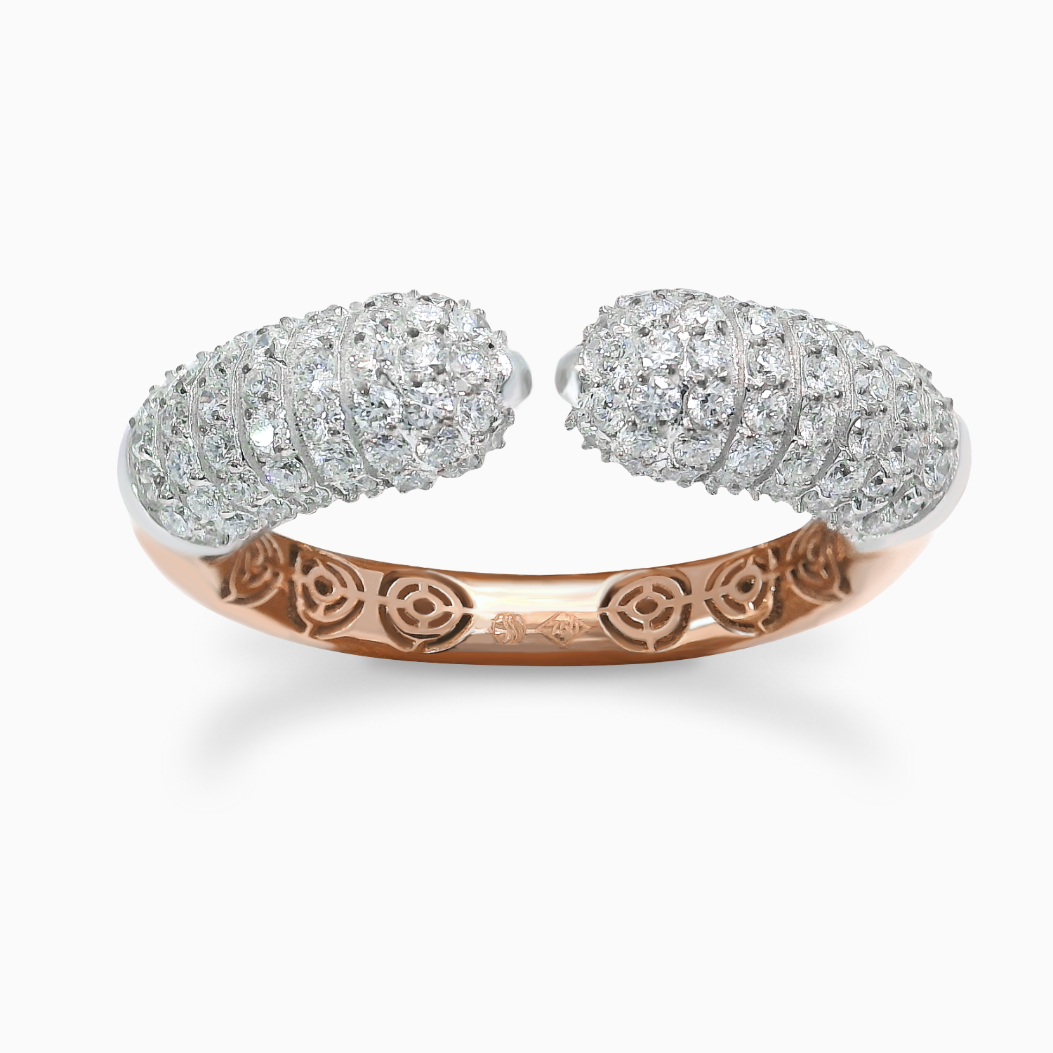 Designed in a striking combination of 18k rose and white gold, this exquisite open pave diamond ring embodies both contemporary elegance and timeless luxury. Featuring 0.75 carats of round cut diamonds in a brilliant full pave setting, it radiates light with extraordinary sparkle from every angle. The refined two tone gold design highlights its modern sophistication, while the open silhouette gives this piece a bold yet graceful character. A true symbol of fine craftsmanship, this diamond pave ring is the perfect choice for women who desire both artistry and opulence. For those seeking a complete look, this design is also available with its matching pave diamond earrings, creating a harmonious and luxurious jewelry pairing.