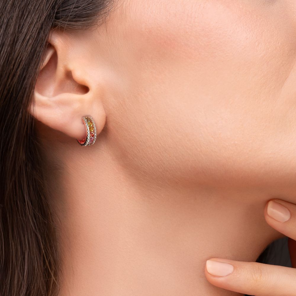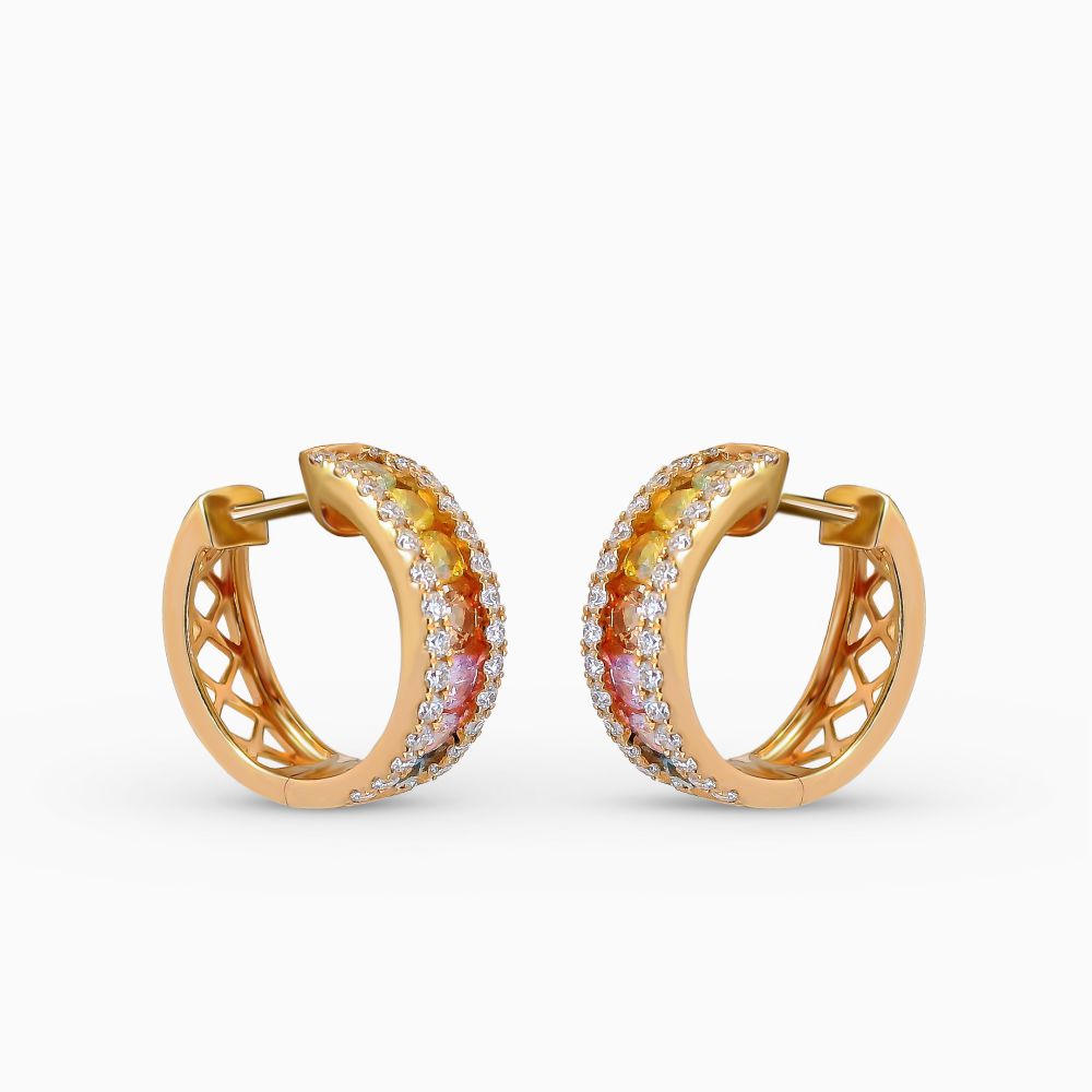 Mavinin, pembenin, turuncunun ve sarının tonlarında toplam 0.99 karat safir içeren bu tasarım, 0.48 karat pırlantanın ışıltısıyla uyum içinde buluşuyor. Altın detaylarla zenginleştirilen bu renkli safir küpe, modern zarafeti ve ince işçiliği yansıtır. Işığın ve rengin büyüsünü taşıyan bu el işçiliği pırlanta küpe, her stile zamansız bir ışıltı katmaktadır.