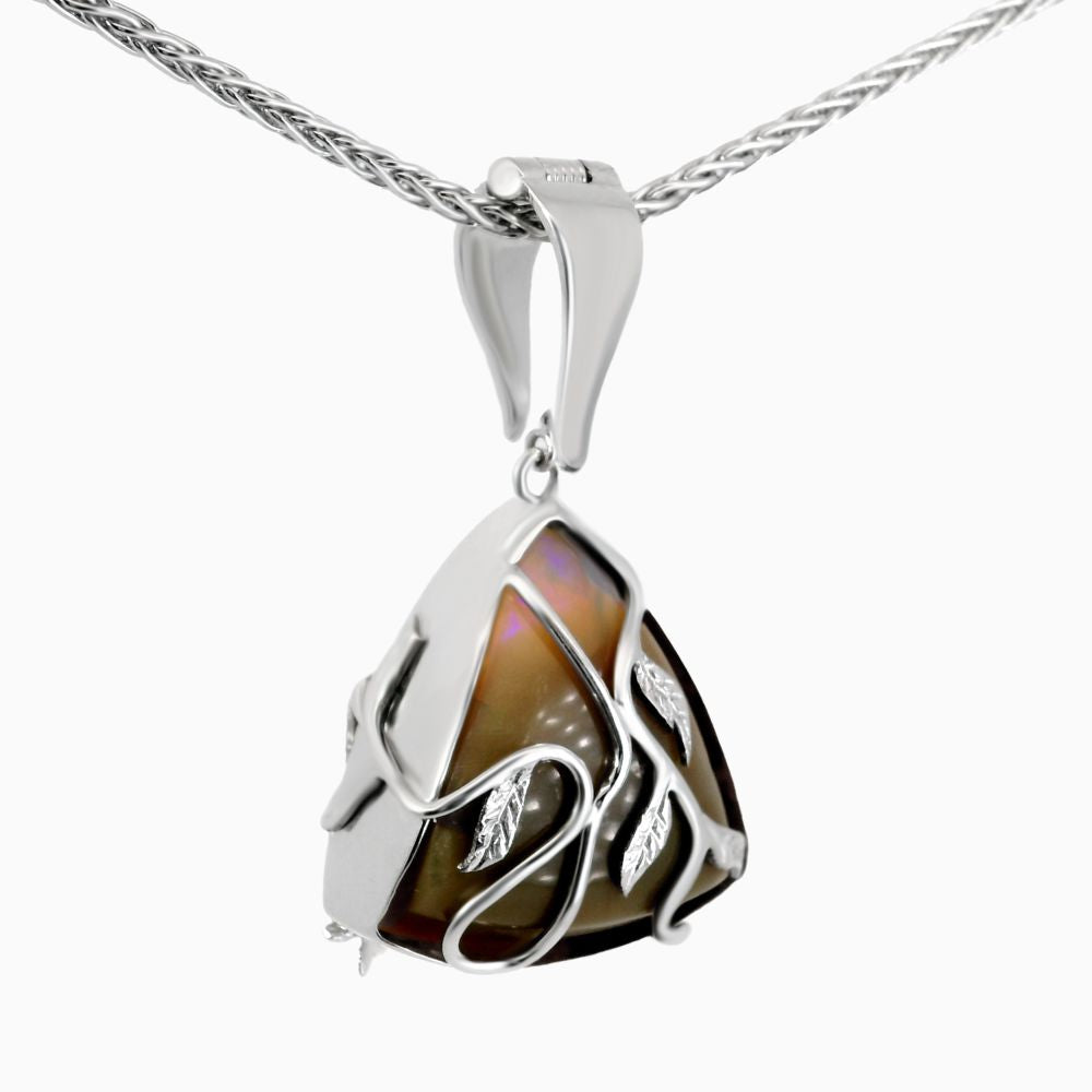 Doğanın mucizesiyle sanatın buluştuğu bu 18 ayar beyaz altın kolye, 21.24 karat ağırlığındaki armut kesim opalin büyüleyici ışıltısını yansıtır. Yeşilden mora, altın tonlarına uzanan renk geçişleriyle opal, tıpkı kutup ışıkları gibi göz kamaştırıcı bir parıltı yaratır. Taşı çevreleyen zarif yaprak ve dal detayları doğanın sonsuz uyumunu simgeler. Aurora Spirit kolye, ışığın, yaşamın ve dönüşümün tek bir formda vücut bulduğu eşsiz bir eserdir.