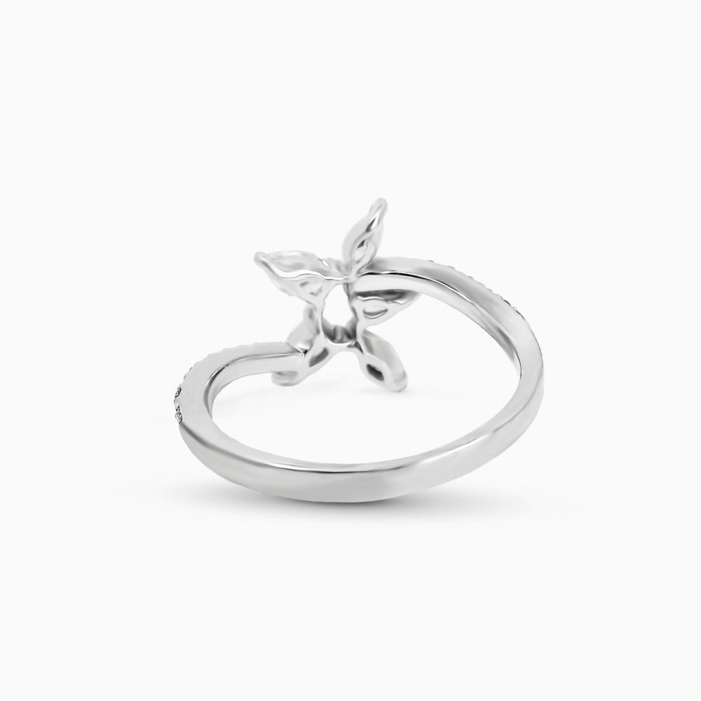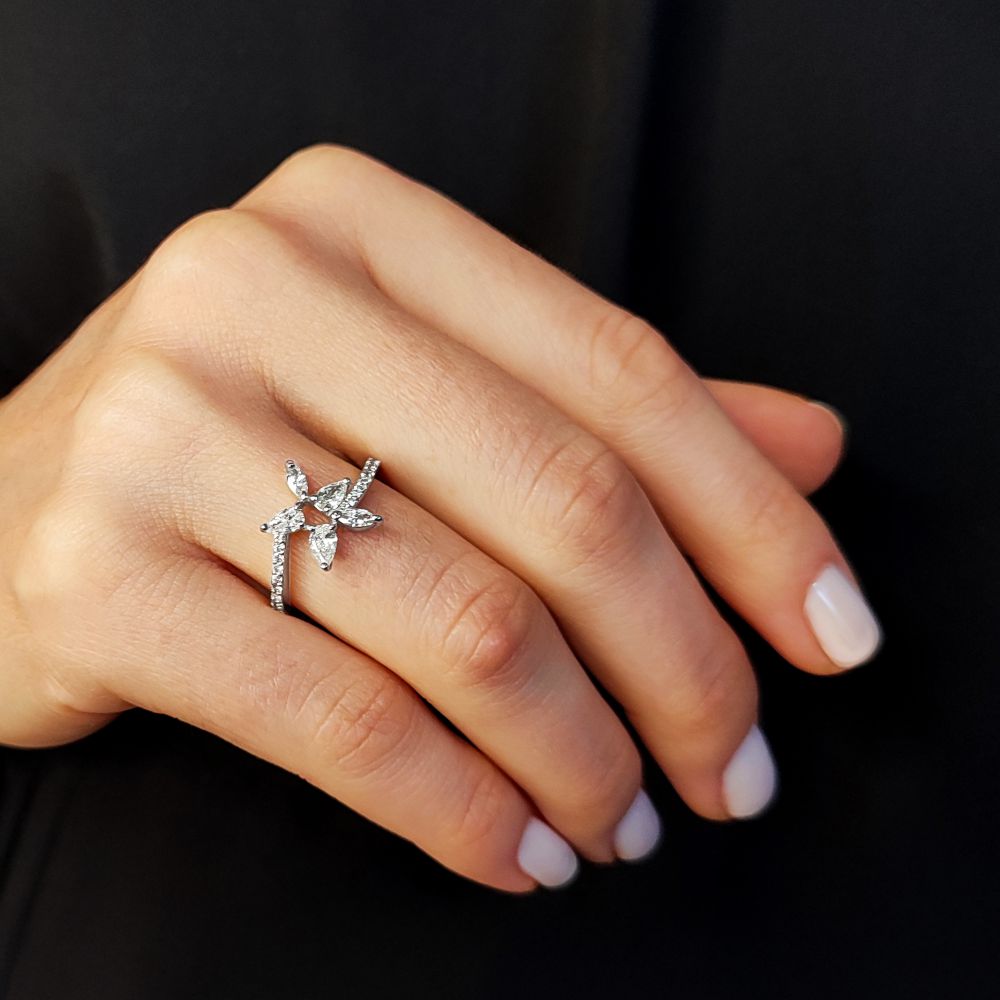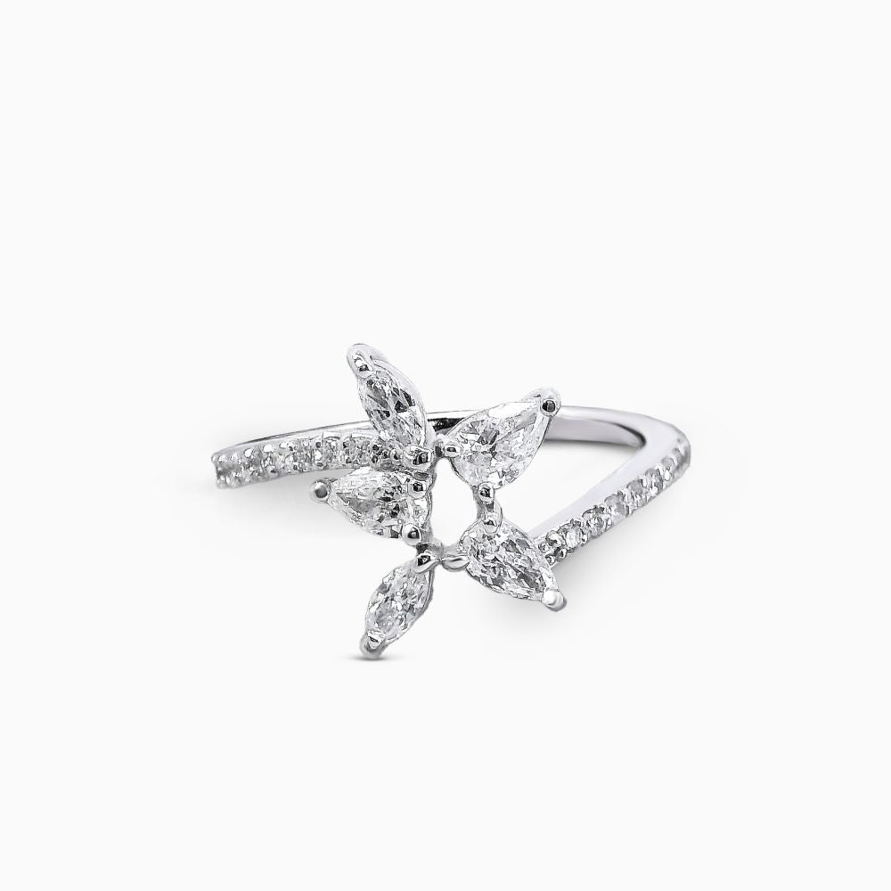 18 ayar beyaz altından üretilen bu zarif yüzük, G rengi ve VS/SI berraklığa sahip 0.70 karat damla, yuvarlak ve markiz kesim pırlantalarla tasarlanmıştır. Beş adet damla kesim pırlantadan oluşan ve ortası boş çiçek formundaki merkez, doğallığın ve saf güzelliğin simgesidir. Yanları pırlantalarla süslenen yüzük, ışıkla doğanın uyumunu zarif bir biçimde yansıtarak zamansız bir zarafet ifadesi sunar.