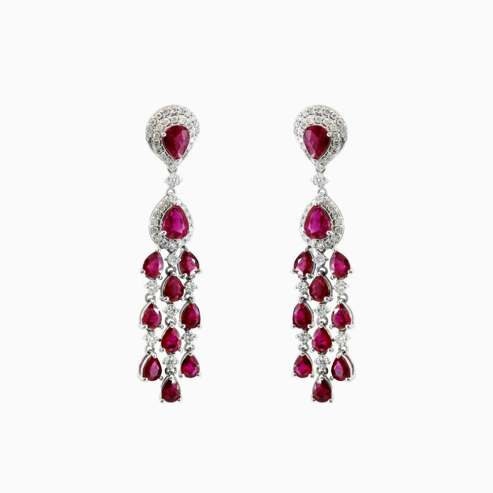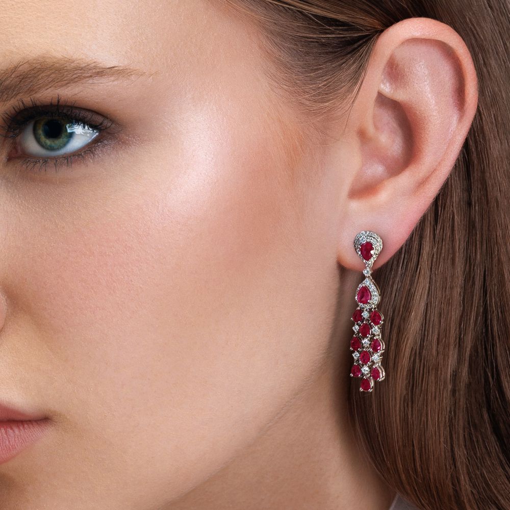 Tutku ve ışıltının zarif bir ifadesi. 18 ayar beyaz altından üretilen bu küpelerde, toplam 4.22 karat ağırlığında 22 adet damla kesim yakut ve 0.77 karat ağırlığında 102 adet yuvarlak kesim pırlanta yer alır. Canlı kırmızı yakutlar, zarif bir şelale gibi aşağıya süzülürken, beyaz pırlantalar onlara ışıltılı bir denge kazandırır. Her hareketle ışığın ritmini yakalayan bu tasarım, renk ve zarafetin büyüleyici uyumunu gözler önüne serer. Crimson Cascade küpeler, zamansız güzelliğin ve ihtişamın simgesidir.