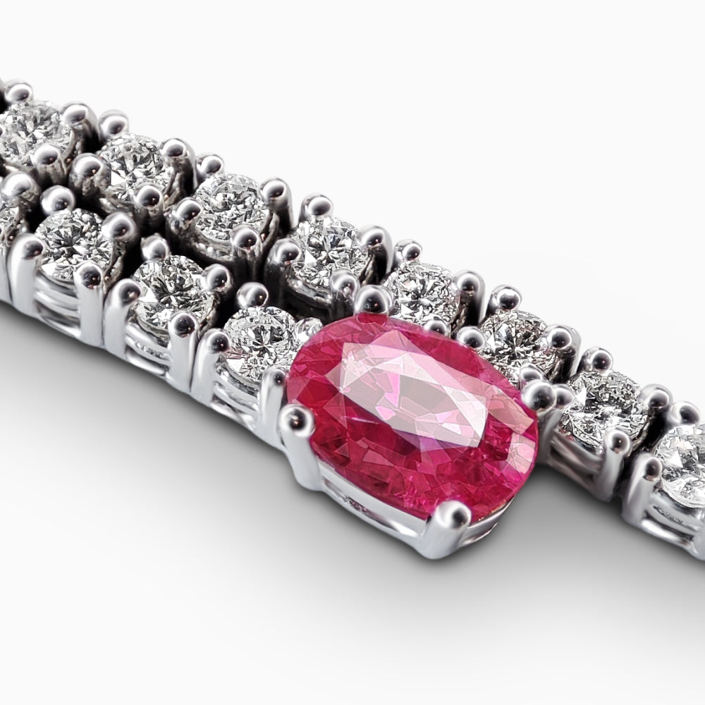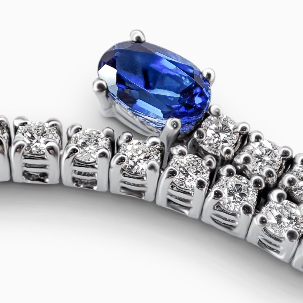 Bu bilezik, renklerin ve ışığın kusursuz uyumunu yansıtır. Ortasında, 0.55 karat oval kesim yakut, tutku ve sıcaklığı temsil ederken; çevresindeki 0.67 karat oval kesim safir, asalet ve bilgelik derinliğini simgeler. Bu değerli taşları çevreleyen 1.15 karat yuvarlak kesim pırlantalar ise tasarıma sonsuz bir ışıltı ve denge katmaktadır. Her taş, Vals'in mükemmelliğe olan bağlılığıyla özenle seçilmiş ve her detay, usta ellerin titiz işçiliğiyle şekillenmiştir. Yakut, safir ve pırlantanın birleşimini taşıyan bu bilezik, zarafetle yansıttıkları ince zevki ortaya koymak isteyenler için özel olarak tasarlanmıştır.