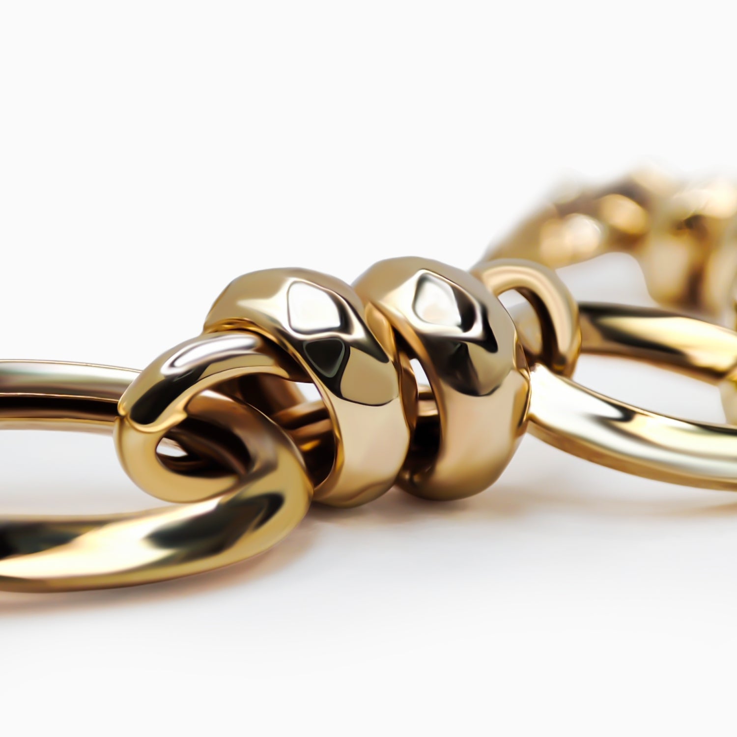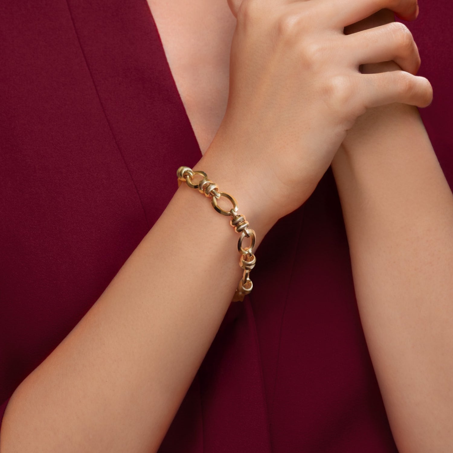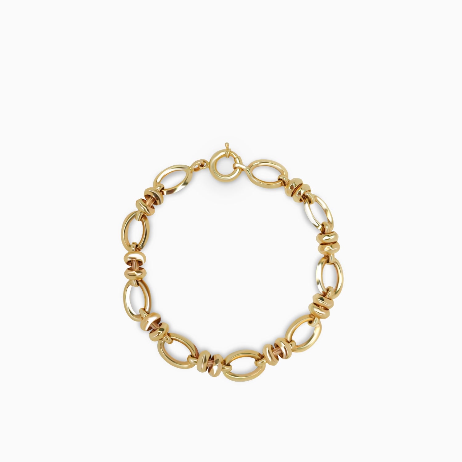 Bu 14 Ayar Altın Zincir Bileklik, modern bir bağlantı tasarımı ile zamansız zarafeti bir araya getirir. Oval bağlantıların ritmik düzeni, bileğe akıcı ve dengeli bir görünüm kazandırırken, bağlantılar arasına yerleştirilen yuvarlak vurgular tasarıma ayırt edici bir karakter katar. Parlak cilası ve heykelsi formu ile bileklik, tek başına takıldığında kendinden emin bir ifade yaratır ve diğer parçalarla kolayca eşleştirilebilir. 14 ayar altının sıcak tonu, hem günlük kullanım hem de özel günler için uygun olan çok yönlülük sağlar. Sade gücü ve rafine işçiliği takdir edenler için tasarlanan bu bileklik, klasik altın takıların modern bir yorumunu sunar.