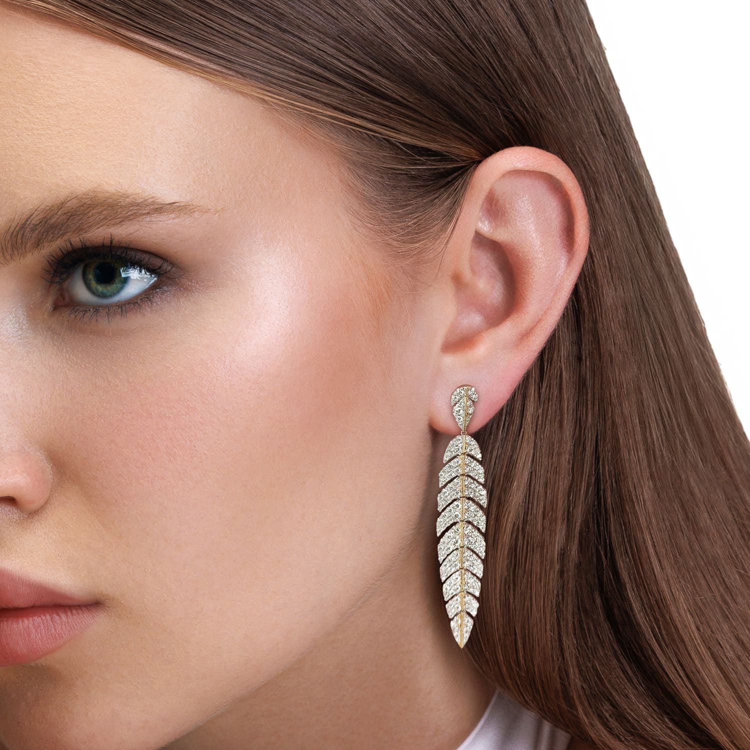 Doğanın zarif güzelliğinden ilham alan bu uzun ve ince küpeler, 18 ayar beyaz altından üretilmiş olup toplam 3.10 karat yuvarlak kesim pırlantalarla süslenmiştir. İnce yaprak formundaki tasarım, her bir pırlantanın ışığı büyüleyici bir ışıltıyla yansıtmasını sağlar ve zarafetin şiirsel bir ifadesine dönüşür. Uzun silüet, hareketle birlikte ışığın akışını takip ederek zamansız bir zarafet ve modern bir incelik sunar. Bu küpeler, saf parıltısıyla her anı aydınlatan lüksün zarif bir simgesidir.