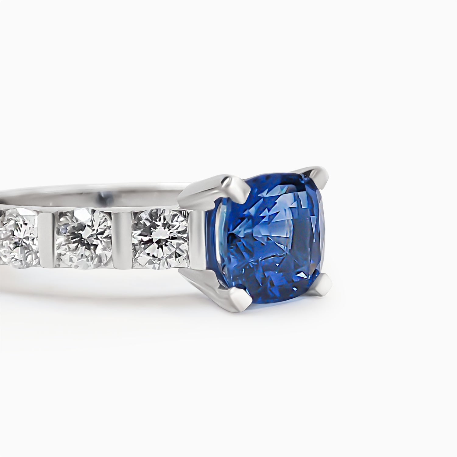 18 ayar altından üretilen bu yüzük, 2.28karat yastık kesim canlı mavi safir orta taşına sahiptir; buna ek olarak F renk ve VS2 berraklıkta toplam 0.84 karat yuvarlak kesim pırlantalar, cesur, sofistike ve zamansız bir zarafet sunar.