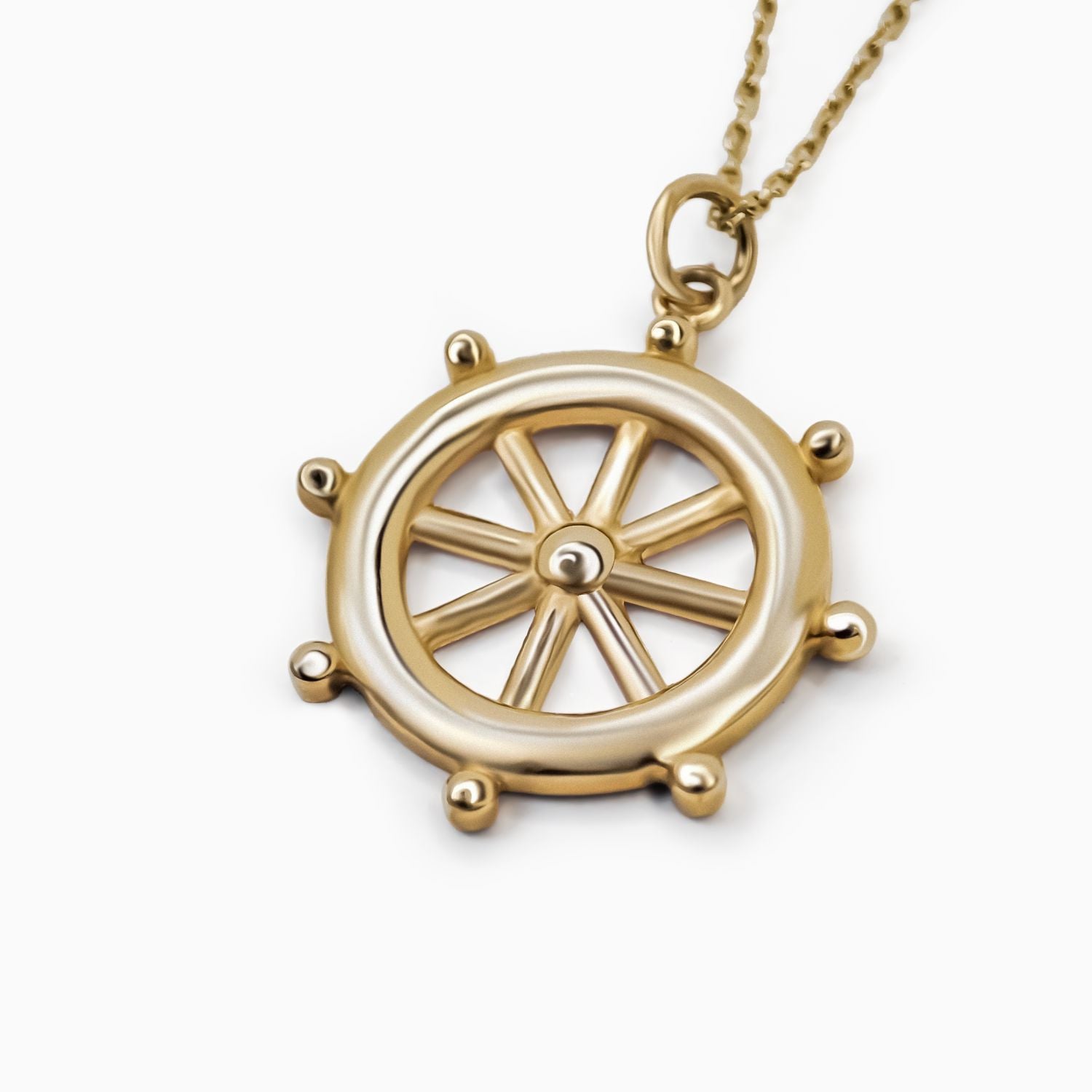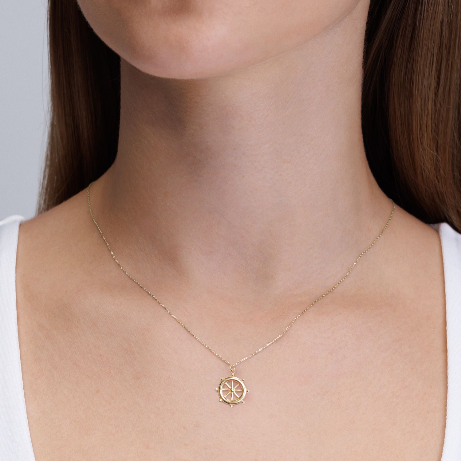 14 Ayar Altın Dümen Kolye Ucu, denizcilik ikonografisinin en güçlü sembollerinden biri olan dümeni, modern bir mücevher yorumuyla yeniden ele alır. Yuvarlak formu ve dengeli oranlarıyla tasarlanan bu parça, yön bulmayı, kontrolü ve kendi rotasını çizme fikrini temsil eder.