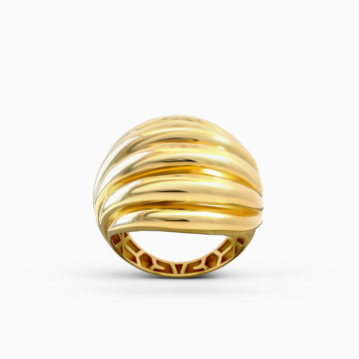 14 ayar altının sıcak ışıltısını, heykelsi ve dalgalı kubbe formuyla birleştiren bu çarpıcı tasarım, zarif bir hareket hissini ön plana çıkarıyor. Yüzüğün parlak yüzeyi, ışığı ritmik bir akışla yansıtarak modern zarafeti ve hafif bir dinamizmi ifade ediyor. Pürüzsüz ama belirgin hacmi, parmakta etkileyici bir duruş yaratırken; akıcı altın çizgiler tasarıma sofistike bir derinlik katıyor. Günlük stile lüks bir dokunuş eklemek isteyenler ve özel anlarda dikkat çekici bir imza parça arayanlar için ideal olan Solare Dome Yüzük, zamansız çekiciliği ve karakteristik tasarım diliyle öne çıkıyor. 14 ayar altının dayanıklılığı ve yüksek parlaklığı, bu yüzüğü sadece görsel olarak etkileyici kılmakla kalmıyor, aynı zamanda her mücevher koleksiyonuna uzun ömürlü bir değer katıyor.