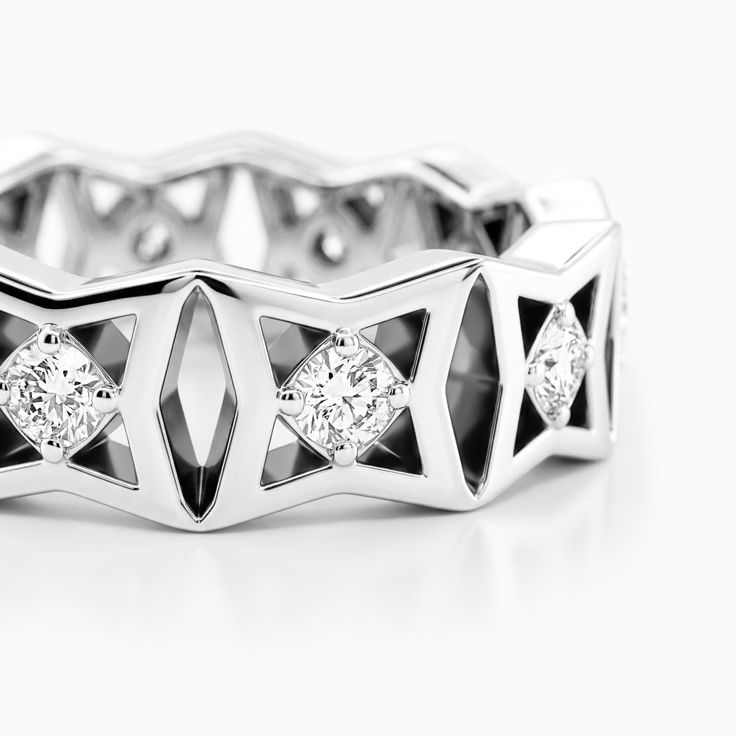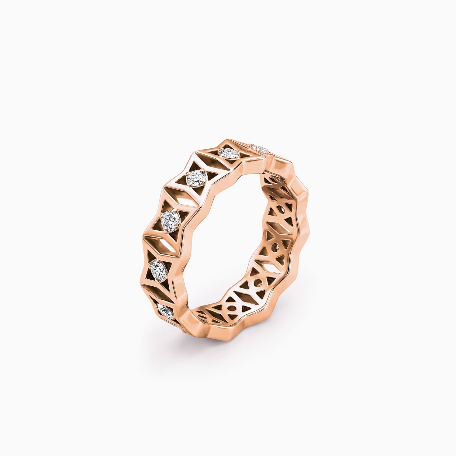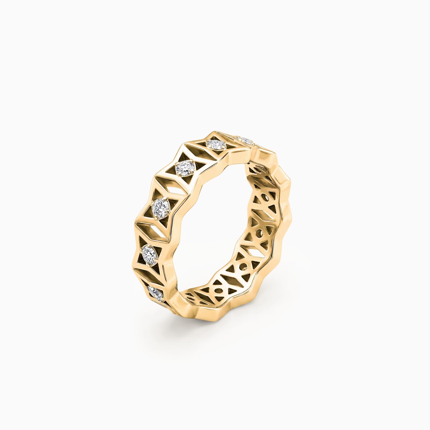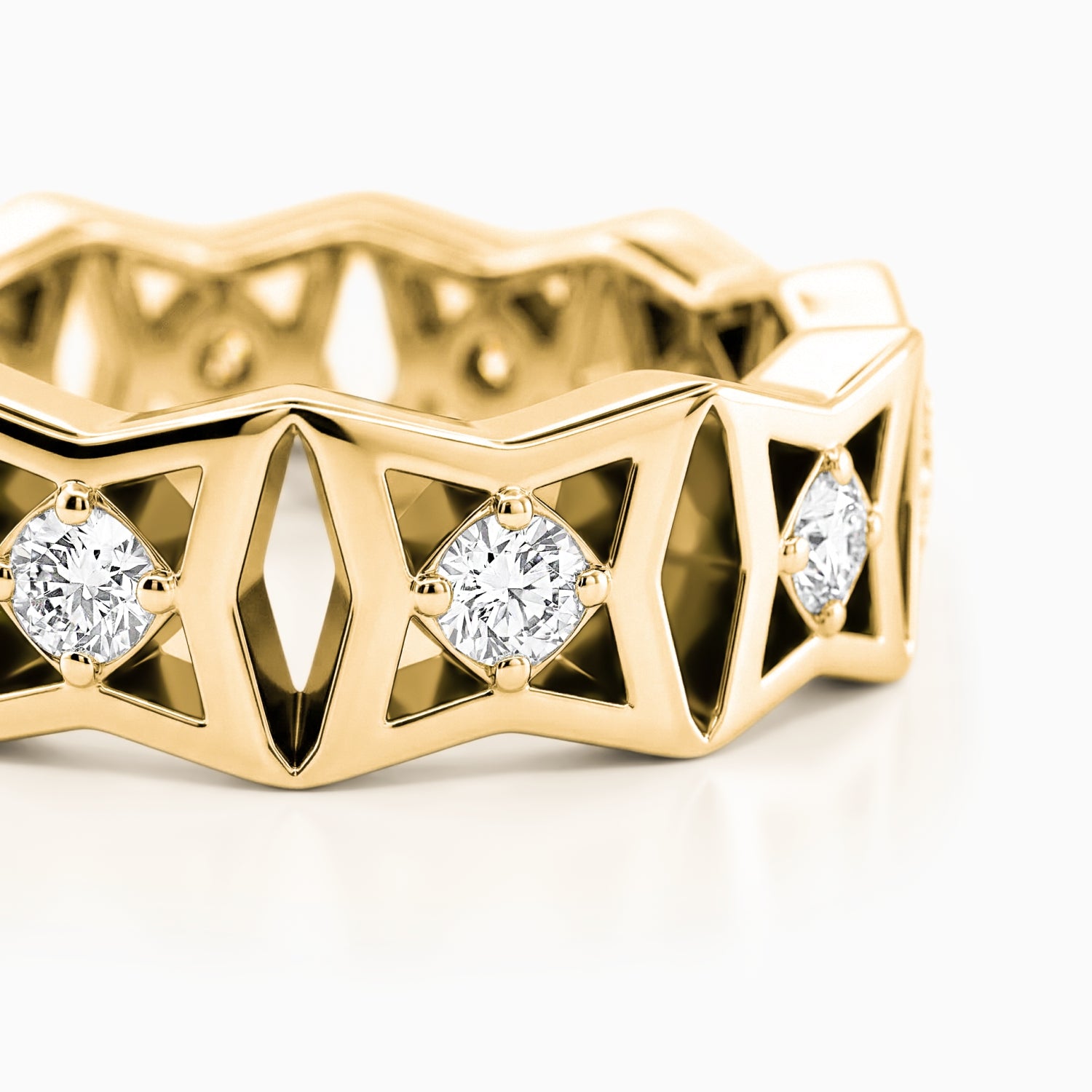 Işık ve geometrinin kusursuz uyumundan doğan bir başyapıt. Mimari bir titizlikle şekillendirilen bu olağanüstü tasarım, 18 ayar altının zamansız asaletini, etrafını saran 0.34 karat pırlantaların büyüleyici parlaklığıyla birleştiriyor. Her bir taş, geometrik silüetinin kenarlarından ışıldayarak yüzüğe çok boyutlu bir derinlik kazandırıyor; ışık, yüzeyinde adeta sonsuz bir dansa dönüşüyor. Güçlü hatları ve ikonik motifiyle bu tasarım yalnızca bir mücevher değil, modern lüksün en çarpıcı ifadesi. Koleksiyonun en çok arzulanan parçalarından biri olarak, günün zarif şıklığından gecenin göz kamaştırıcı ihtişamına uzanan bir yolculuğu temsil ediyor ve gerçek bir zamansız ikonun özünü taşıyor.