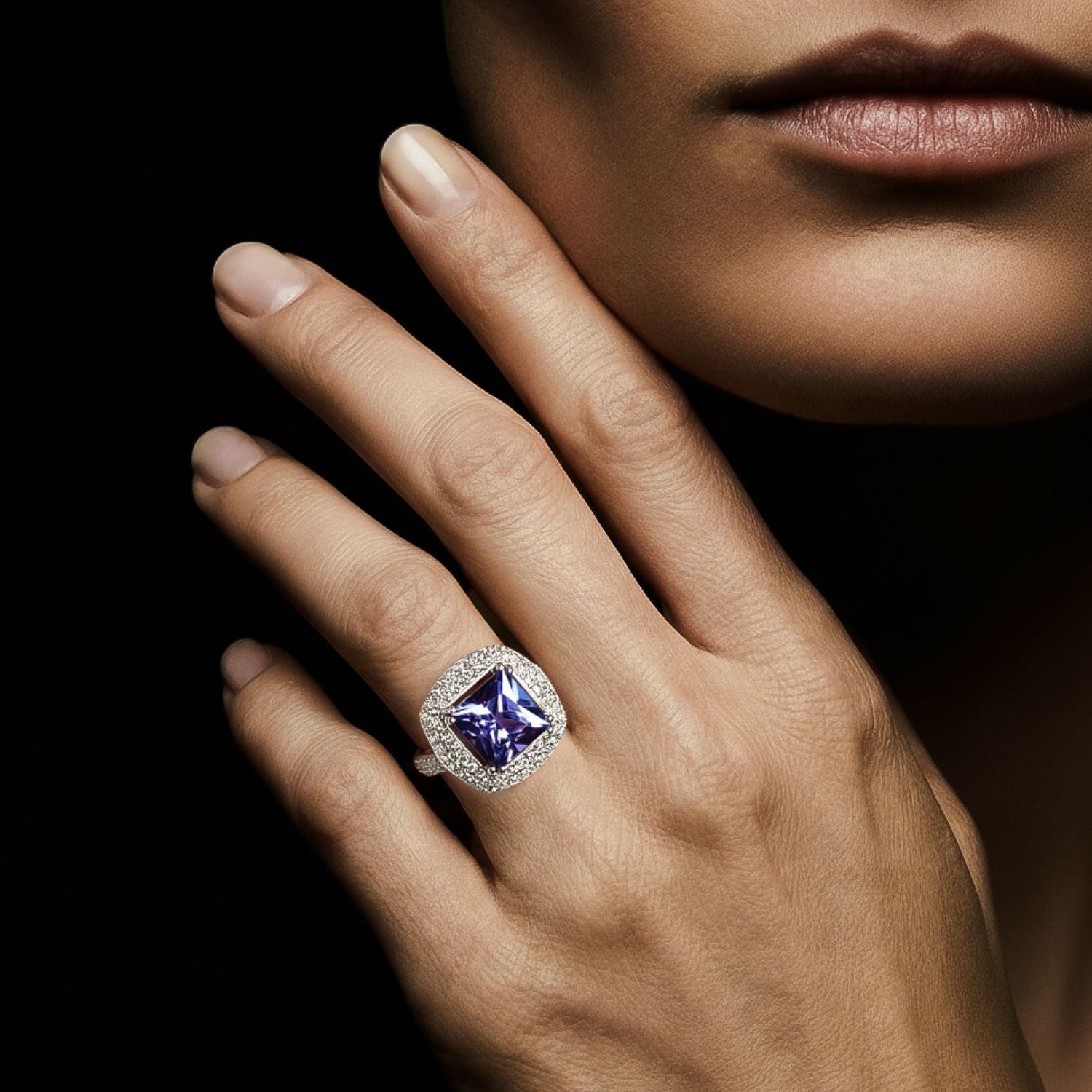 Zarafetin kusursuz bir ifadesi olan Monet yüzük, tanzanitin büyüleyici cazibesini ve pırlantaların zamansız ışıltısını, 18 ayar altının göz alıcı parıltısında bir araya getiriyor. Merkezinde yer alan 4.89 karatlık blush violet tonlarında, kare kesim ve GIA sertifikalı tanzanit, bakışları üzerine çekerken; etrafını saran toplam 1.30 karat değerinde, F renk ve VS1 berraklık kalitesine sahip 96 adet yuvarlak kesim pırlanta, bu görkemli taşı zarifçe tamamlıyor.